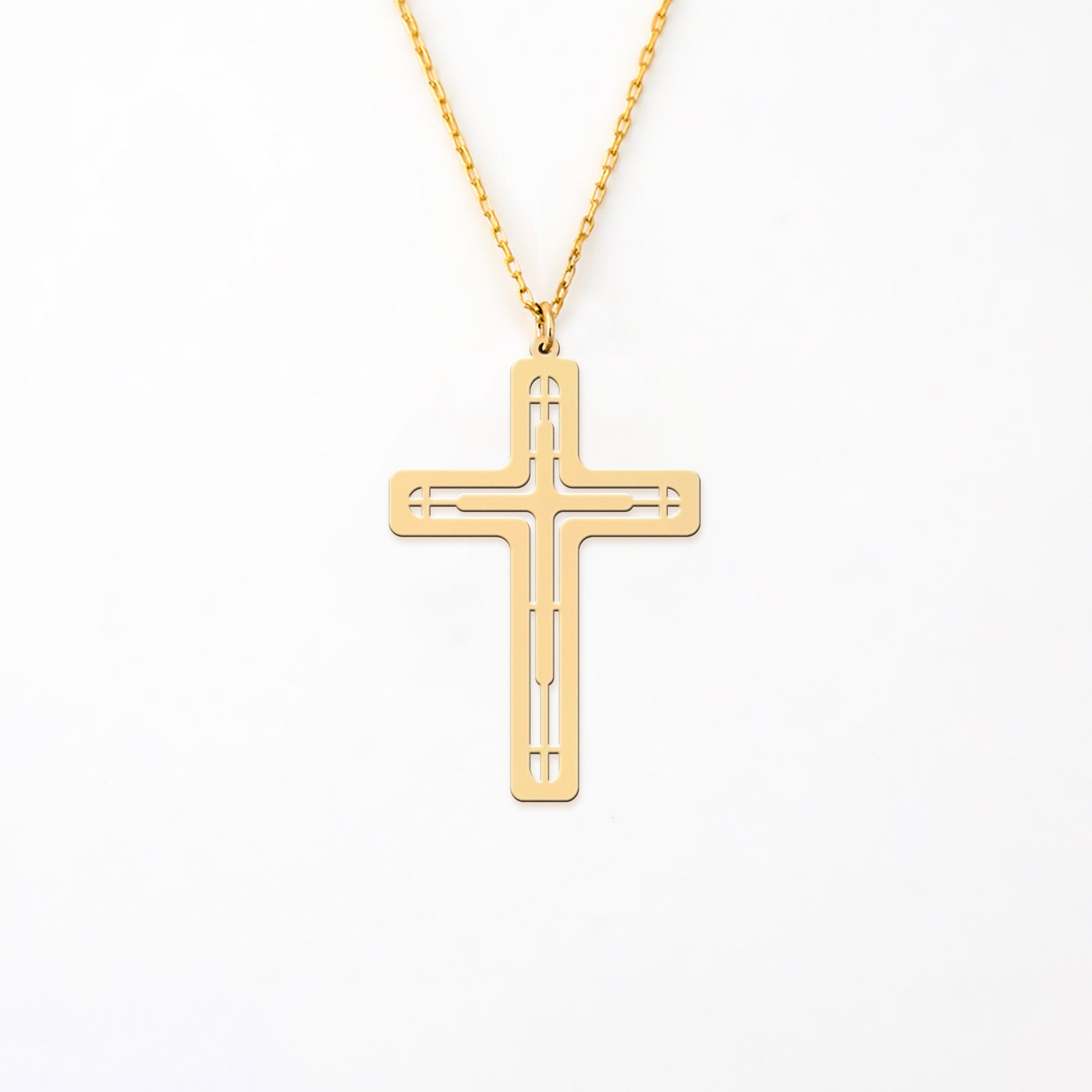 Introducing the Holysteller Neoclassical Cross Necklace, elegantly crafted from 925 sterling silver and adorned with a lavish 14K gold plating. This exquisite piece features a neoclassical cross pendant that combines traditional Christian symbolism with a modern aesthetic, ensuring it stands out as a unique addition to any jewelry collection. The refined design allows it to be a subtle yet powerful expression of faith that complements both formal and casual attire.