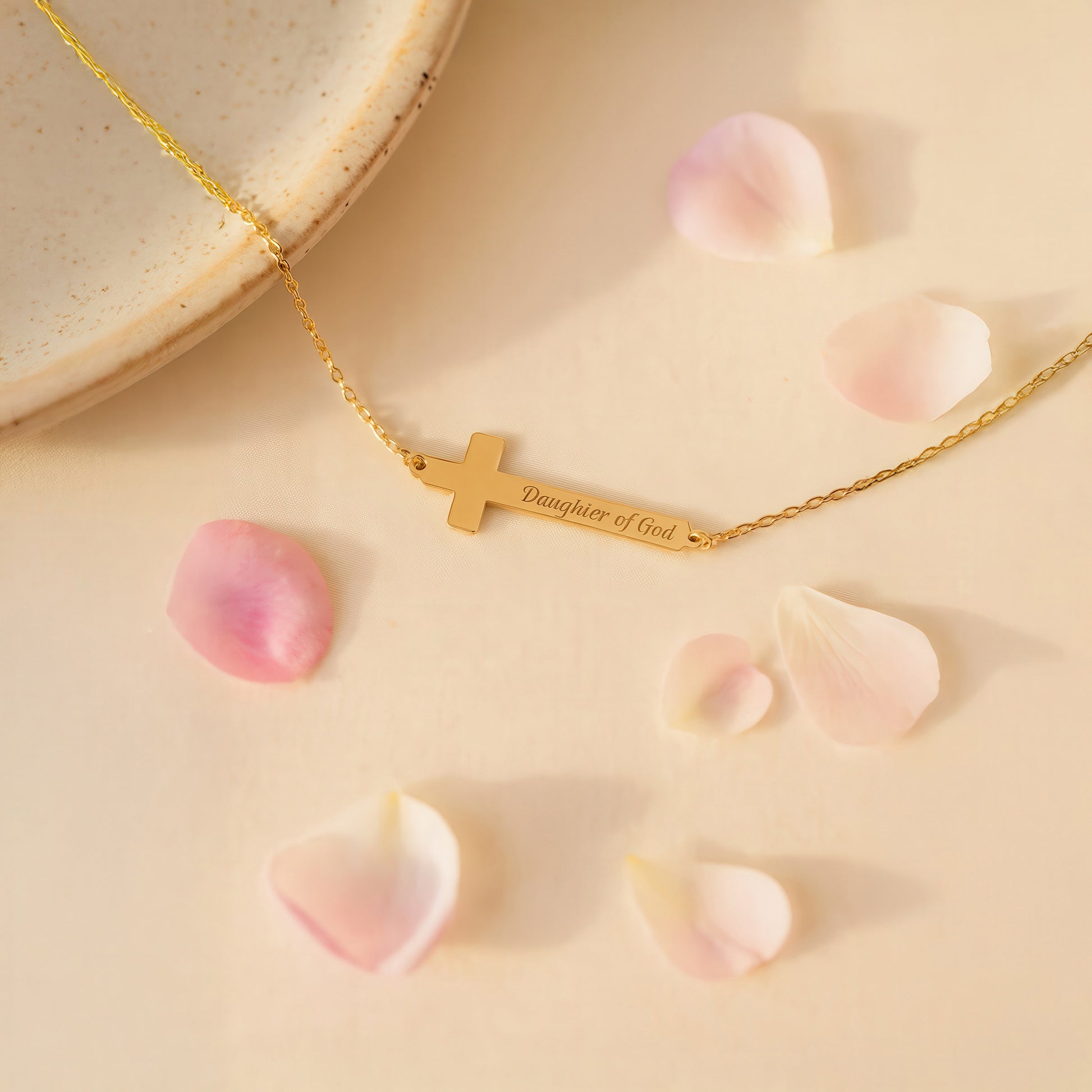 Elevate your style with the luxurious HolySteller's Gold-Tone Engraved Cross Bar Bracelet. Meticulously crafted from top-grade Sterling Silver, gold plated for a touch of grandeur. A perfect personalized jewelry gift that promises elegance and durability, and much more.
